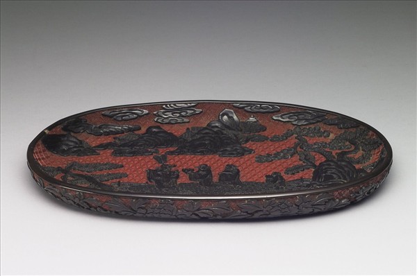 橢圓形盤,弧形盤沿,圈足,足內髹黑漆。底面盤沿刻折枝花卉,底鋪紅漆錦地,花葉作黑漆,二長邊分別為牡丹及茶花,短邊為梅花,二、三枝幹自足沿伸出,橫向延伸,花瓣葉片平鋪,起伏少,少重疊,打磨光滑,風格平實。盤心作山水人物,前景保留黑漆,最前方一排石頭與矮樹,地面刻錦地,中央刻三立人與二童子,最前一人似為高官,旁邊一侍者手持儀仗,回首看著隨後的二人,二人亦著官服一人手捧一爵,另一人手捧物,回頭看著身後亦捧物的童子,似欲晉獻。畫面兩側石頭後方高聳著松樹等,遠處岩石層疊向更遠處延伸,山石旁隱約露出樓閣屋頂,中景及遠景為紅漆錦地。漆質澀,漆層薄,刀法凝滯,多用減地法描寫。山脈的結組方式層層堆疊往後延伸,與吳歷的山水有類似處。從人物的形貌、動作推測,可能是加爵晉祿的吉祥題材。
