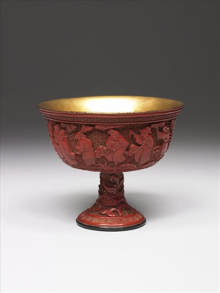 撇口,深腹,高足,杯內髹金漆,足底髹黑漆。口沿作帶狀錦地,杯腹刻三組嬰戲人物,在大石旁是玩捉迷藏的二童子,二位觀看者帶進另一組賞畫的四童子,旁邊二位持荷葉者又轉接騎竹馬的二童。人物的連接順暢,圓柱高足上刻蟠繞的螭紋,嬰戲與螭紋均雕錦地,工藝繁瑣,兒童頭大身短,臉形似大人,身軀肥胖,表情誇張,杯腹與足相連接處雕一圈葉狀飾,漆色紅,漆質堅,刻法規矩。底有「宣德年製」四字款。