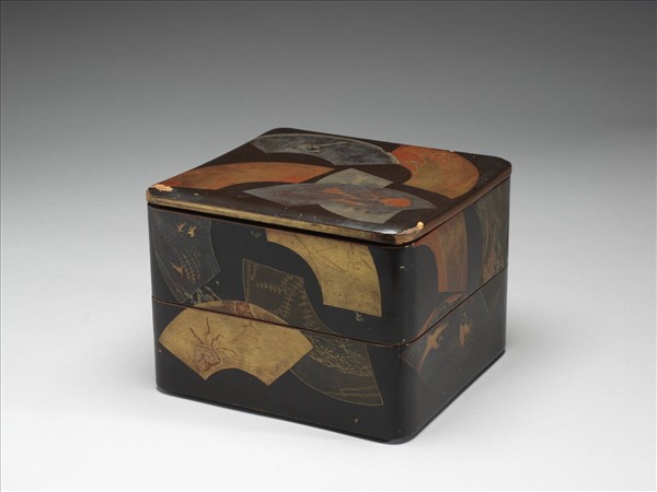 盒面平,轉接面修成圓弧,每一層和底部均兩木條突起,正好卡住下層盒,可能不只兩層。內置玉器百件,黑褐底描扇形飾,扇形內或以描海天水鳥、水柳亭閣、鶴、秋草為題,器內紅漆。漆薄,色悶不顯。