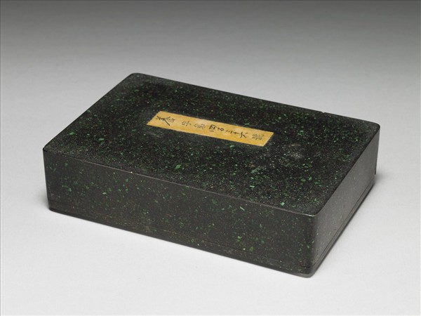 長方形,子母口。以犀皮技法製作出黑地綠點之漆盒。內置故文137之石硯。