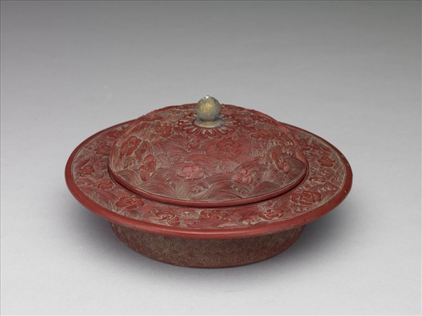 子母口,折沿,淺壁,平底,帶圓頂子母口蓋,金屬寶珠鈕。圖案以剔紅製作而成,蓋鈕周圍飾一圈蓮瓣紋,蓋外及折沿內飾水紋錦地,其上雕飾梅花紋,口沿外側飾繡球紋錦,器外壁飾龜甲紋錦。盒底內外及蓋內髹黑漆。