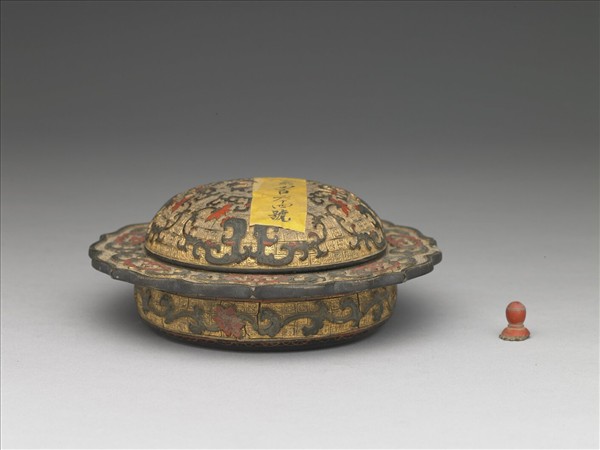 子母口,七瓣雲形折沿,淺壁,平底,帶圓頂子母口蓋,紅色木質球鈕已鬆脫。器蓋、口沿內及器外壁飾黃色格紋錦地,其上貼飾紅色或黑色圖紋。蓋鈕周圍有八枚花瓣紋,其外飾一圈拐子龍紋,蓋緣有相間圖案化夔紋與蓮紋;口沿內部飾勾雲如意雲紋,器壁飾卷草紋及蓮花紋,口沿外髹黑漆彩繪四季花葉紋,盒底內及蓋內為黑底描金卷枝花卉紋。