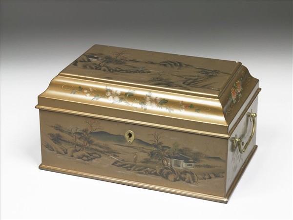 長方形盒,盒內髹褐漆,盒底髹黑漆。盒外金漆。梯形頂,斜面飾花卉,花卉色料調油繪製。三個長邊皆繪山水人物圖,一條河佔畫面中央,自遠方轉個彎向前景流動,兩側一面是山崖,另一面是台地,小屋兩、三間,一人正走向棋跨河面的橋,遠方山巒橫越畫面,黑色是主色,點綴白與藍,以繪畫的手法表現漆繪。