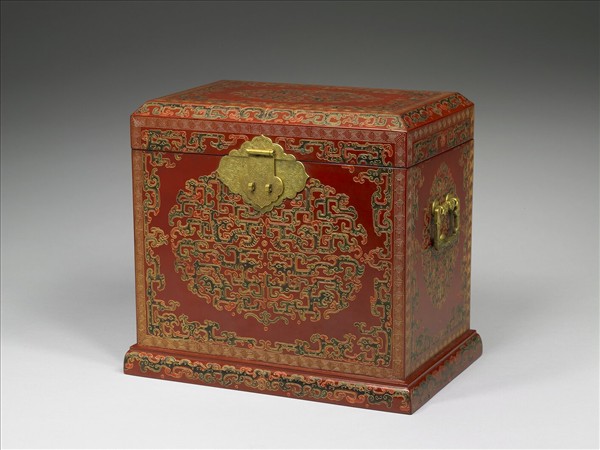 紅漆戧金小櫃,櫃作盝頂,連身蓋,內附三層屜,屜外為紅漆戧金彩漆花卉,盒內灑金。小櫃各面之外框飾回紋,框內以變形鳳紋為主要紋飾。分解成小單元的龍、鳳紋,重新組合成一團鳳形紋飾,細碎的小單元作對稱又相連的安排,輪廓線內再以色漆彩繪,漆色暈染,深綠、橘等,充分展現乾隆朝以古代元素重新組合,形成細緻精巧的裝飾風格,搭配大片金屬菱形鎖葉和側面的方形提環,更顯皇家的氣派與品味。