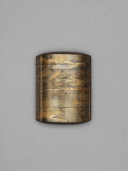 盒作高裝扁狀樣式,分為四層,與盒蓋共成五節,兩側面各有一通孔,可以穿繩索便於攜帶。口部與壁垂直,腹壁短矮,器底略圓。盒身髹褐色漆,描金漆繪山水、樓臺、船橋、樹木等風景圖案。花紋間加飾戧金,盒裏髹紅色漆灑金星。