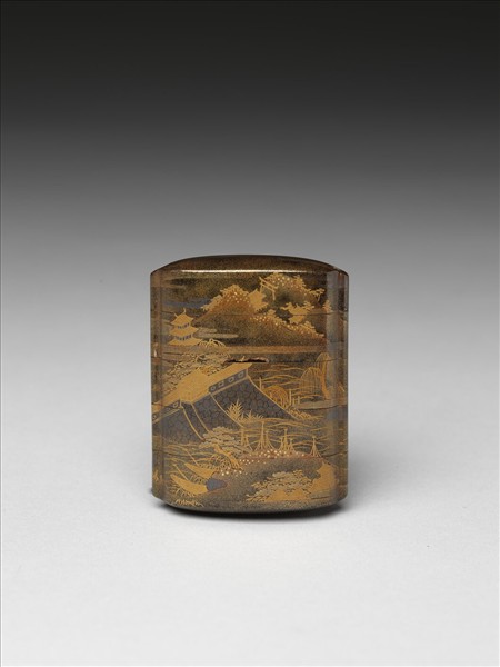 印籠原是藥盒,江戶時代成為武士繫在腰上不離身的裝飾品,日本蒔繪外銷各國時,更脫離原有的實用功能,成為收藏者賞玩的器類。畫面中的城池基石堅固,城前船隻密佈,遠山間有塔寺、神社,在蒔暈的技法下,每一吋空間都瀰漫著濃濃的空氣,彷彿訴說著當時繁忙的貿易。