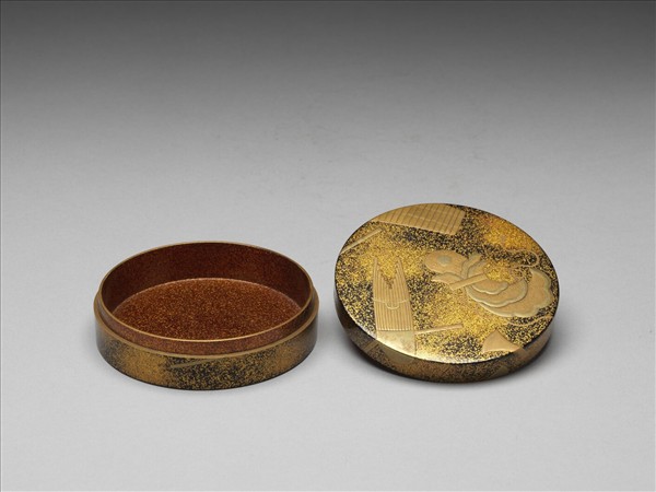黑漆地上散置揚琴、笙、笛等樂器及鳥兜,樂器上付描唐草等各式紋樣,金與青金配合下顯得十分耀眼。器內梨地,底款「梶川作」。