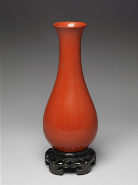 瓶口微張,弧形頸,腹部位置低,輪廓圓滑順暢,以夾紵法製成,器身輕薄,內外髹紅漆,漆色偏黃。五如意形足座,褐漆灑金,和紅漆瓶形成完美的結合。漆瓶的顏色十分特殊,紅色中加入白色,是福州沈紹安一系發展出的特殊技法,在三原色漆中調入汰白,沖淡漆色。漆座中灑金的效果,也是在漆中調入金箔碾成的金泥而得,十分搶眼。