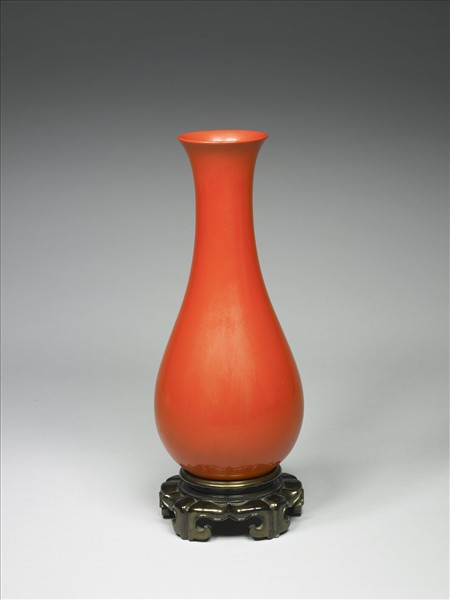 瓶口微張,弧形頸,腹部位置低,輪廓圓滑順暢,以夾紵法製成,器身輕薄,內外髹紅漆,漆色偏黃。五如意形足座,褐漆灑金,和紅漆瓶形成完美的結合。漆瓶的顏色十分特殊,紅色中加入白色,是福州沈紹安一系發展出的特殊技法,在三原色漆中調入汰白,沖淡漆色。漆座中灑金的效果,也是在漆中調入金箔碾成的金泥而得,十分搶眼。