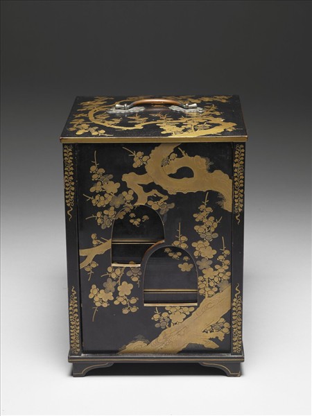 提盒四面四柱,上加一頂,頂略隆起成弧,四面開拱形窗,盒下四足,造型特別。全器以黑漆地高蒔繪為主,切金、青金並用,梅幹蒼勁,構圖大膽,梅幹配合器面的轉折而轉折,五面可連成一幅完整的畫面,每一面又各自可獨立成幅。盒內有四屜,每屜平蒔繪梅花鐶台亦作梅花形飾,盒內髹黑漆。