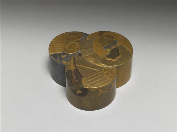 內存玉三羊開泰及太極圖四件。盒蓋三圓分別作沃懸地、濃梨地及銀地,利用對比的手法,使畫面富於變化。高蒔繪鼓、古箏、笛、鈸、笙、鳥兜等,樂器位置安排靈活,或隨圓形而止,或跨至盒側,構圖氣勢大。鼓、鳥兜等質感及紋理描寫細膩。盒內梨地。