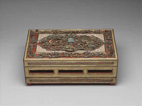 漆盒,蓋面分三層裝飾,中心如意形開光內以點翠壽字為中心,兩側嵌纍絲龍鳳花草紋,飾點翠及鑲各類寶石。第二層方框內緝米珠為地,以珊瑚米珠列萬字雙方格紋。最外層四角點翠花朵中心嵌紅色寶石,以纍絲龍紋花草嵌各式珠寶飾點翠。盒壁四面上下各飾一條緝米珠,開鏤空編織紋方格。