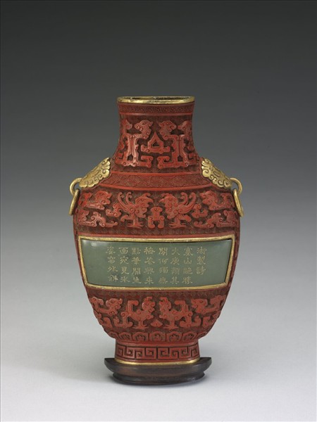 這對銅胎雕漆轎瓶,皆寬口微撇,削肩,碩腹下斂,矮圈足,肩上金屬獸環耳。瓶身剔紅回紋錦地,頸項螭龍紋,肩上淺雕團壽。器身中央鑲嵌碧玉為開光,內鐫刻「御製詩:塞山絕勝大庾嶺,其間何獨無梅蒼。興來點筆開生畫,宛見冰姿窗外斜」陰文隸書一首,內填金彩。開光上下剔鳳紋及螭龍紋,近底處蓮瓣紋,圈足回紋一圈。為仿古紋飾雕漆作品,層次繁細,用刀鋒利銳直,應為十八世紀左右的作品。這組銅胎剔紅嵌玉轎瓶集銅、玉、漆多種材質於一體,在漆器作品上極為罕見。 清代轎瓶多以成對出現,插人造花,因常以絲絹作花,故宋代以來有「綵花」之稱。例如清乾隆皇帝的書房「三希堂」,現仍保留乾隆當時的原貌,牆面上滿掛綵花轎瓶,可見得此類花瓶也為書齋陳設器。