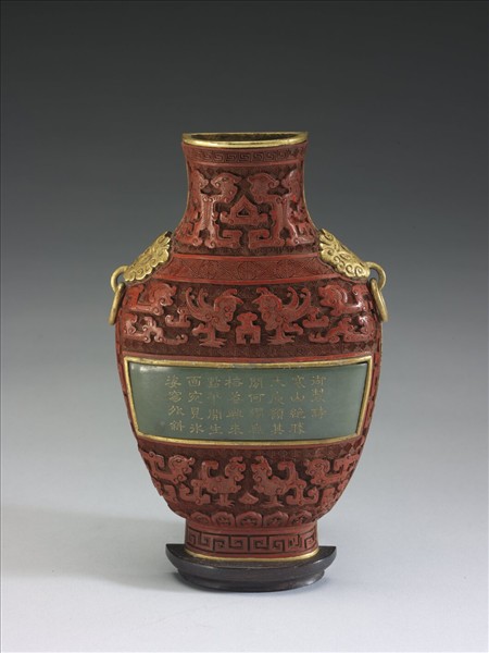這對銅胎雕漆轎瓶,皆寬口微撇,削肩,碩腹下斂,矮圈足,肩上金屬獸環耳。瓶身剔紅回紋錦地,頸項螭龍蚊,肩上淺雕團獸。器身中央鑲嵌碧玉為開光,內鐫刻「御製詩:塞山絕勝大庾嶺,其間何獨無梅蒼。興來點筆開生畫,宛見冰姿窗外斜」陰文隸書一首,內填金彩。開光上下剔鳳紋及螭龍紋,近底處蓮瓣紋,圈足回紋一圈。為仿古紋飾雕漆作品,層次繁細,用刀鋒利銳直,應為十八世紀左右的作品。這組銅胎剔紅嵌玉轎瓶集銅、玉、漆多種材質於一體,在漆器作品上極為罕見。
