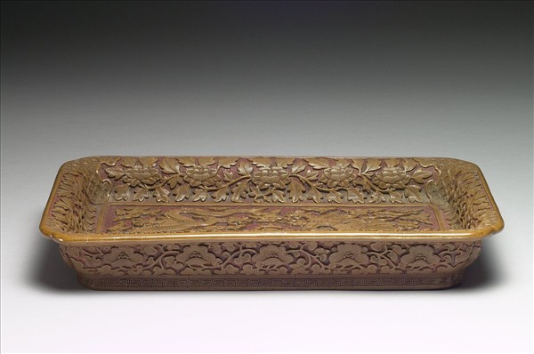 長方形盤,侈口,淺壁,矮圈足。漆分黃、紅,以黃色為面,紅色為地。盤心黃漆雕壽山福海、雙龍戲珠;紅漆斜方格及水波紋為錦地。盤內四角邊黃漆各雕如意雲頭及纏枝牡丹,紅漆錦地則為斜方格紋。外壁盤沿紅漆素地,上雕黃色纏枝花葉。足圈回紋一周,外底上方針刻填金「大明永樂年製」六字橫書楷書款。然,雙龍造形僵硬,缺乏張力;雲紋結組混亂,錦地線條模糊;漆層薄,色滯,且刀法凝鈍等風格現象則反應出明代晚期雕漆風格特色。