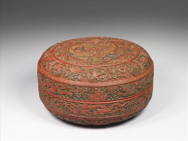 穹頂,圈足,盒底及盒內髹黑漆,盒外剔彩,漆層由下而上為黃、紅、綠、黃、綠、紅。盒蓋一圓形分內外,圓內頂著兩交錯的正方形,龍居中央,龍身盤旋,龍首居中,口中吐出一圓球,球內一「壽」字,三角形內、外雕八寶等。圓形外圍為八個鳳鳥小圓,間隔著花卉或八寶。盒側垂直面為行龍奔走於海面上,以山石相隔,或回首或昂首。盒身雕相同的龍紋及花卉鳳紋。全器以紅色為主調,龍以黃色為表現,此外綠色及黃色用以陪襯,底飾錦地,用色鮮艷,雕刻繁複,細節眾多。漆層薄而不堅,漆與胎之間似無織品,附著不牢,刀法純熟,或工整剔去上層,或以斜刀表現漆層色彩的變化,是嘉靖時期的佳作。