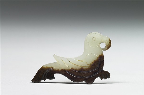 玉質,片狀,全器作側身鳥形,陰刻出鳥羽,尖喙、尾著地,喙下勾成圓孔,器下側泌呈深褐色。為仿西周早期的作品。