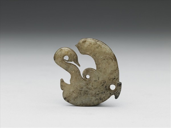 青白玉,受沁略呈灰色,神人有臣字眼,髮絲清晰,受玉料限制,有變形的鼻端以及收束如尖羽的身軀,此皆為西周中期神人常見的特徵。