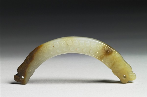 玉質,形如珩,兩端飾獸首,器面飾雲紋,獸口處作圓穿。是仿戰國晚期至西漢的件品。