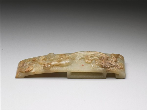 玉質,有土泌斑,面琢浮雕回首神獸。劍璏本是嵌飾於劍鞘上的飾物,同時具有用以固定革帶的功能。本器為仿漢的作品。