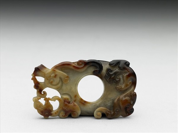 玉質,因沁染而有赭紅斑,呈橢圓片狀,中有圓孔。正面飾浮雕神獸,背飾陰刻雲紋。本器為仿西漢作品。