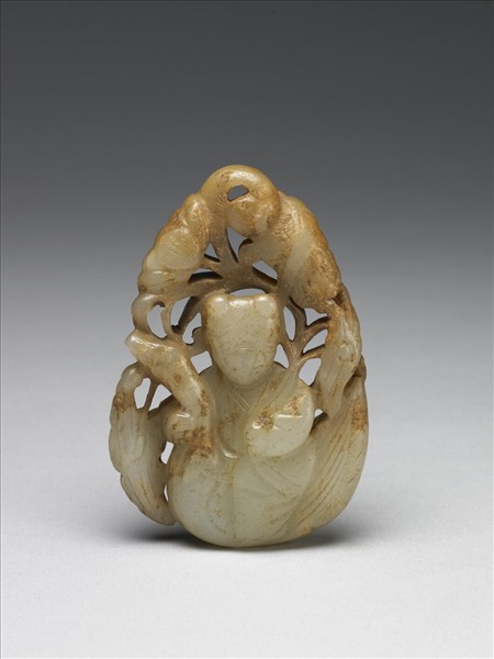 玉質,褐色泌斑。鏤空雕一童子,胸前手扶一鵝,背飾荷花,上端有穿。