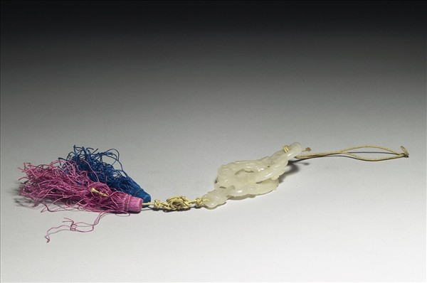 玉質。全器為兩相連圓環,每一環整體飾龍紋,上有結繩,下有紅、藍絲穗各一。