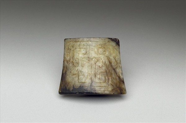 玉質,有雜斑。略呈梯形,面飾雙勾雲紋。珌(摽)是嵌飾於劍鞘末端的飾件。