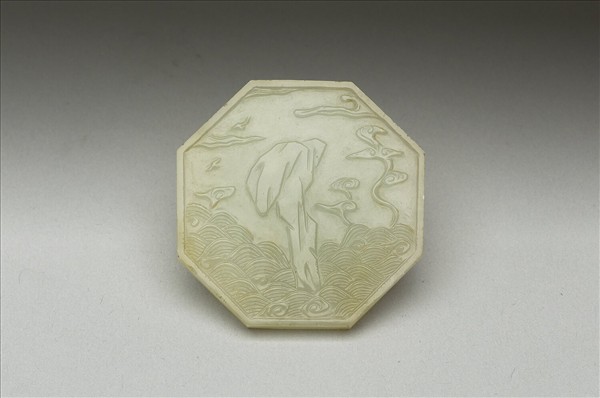 玉質。八角形片狀,雙面紋飾略有不同,飾有湖石、仙鶴、靈芝、波濤紋。