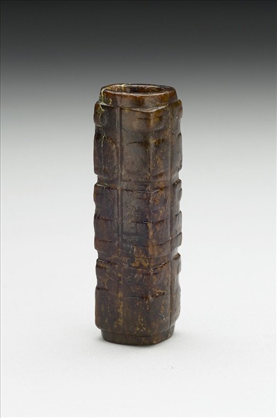 受沁染呈赭色玉。方柱體,上下有短射口。四壁略呈圓弧面。紋分四節,節間有明顯的凹槽相隔。自上而下交替琢小眼、大眼面紋。