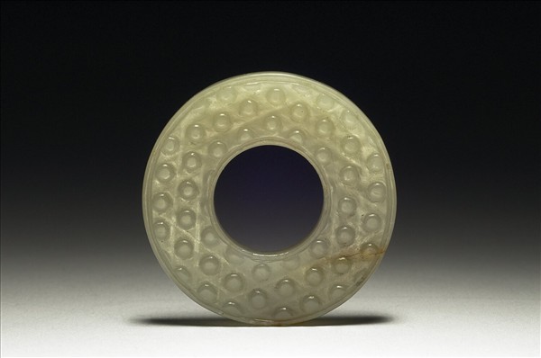 玉質,圓璧形,有廓,雙面不同紋,一面飾乳丁紋,一面琢雲紋。