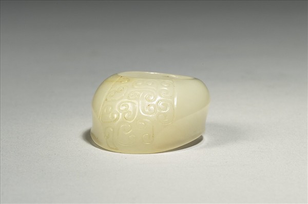 玉質,圓筒狀,尺寸乃配合姆指的大小,一面琢雲紋。韘是射箭時配帶在姆指上,用以鉤弦的工具,現已無實用功能。