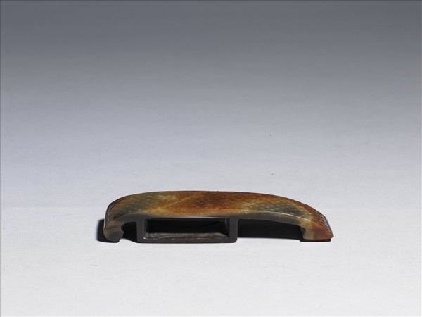 色帶赭紅、青,面琢乳丁紋。劍璏是嵌飾於劍鞘上的飾物,同時,具有用以固定革帶的功能,本器是仿漢風格的仿古作品。