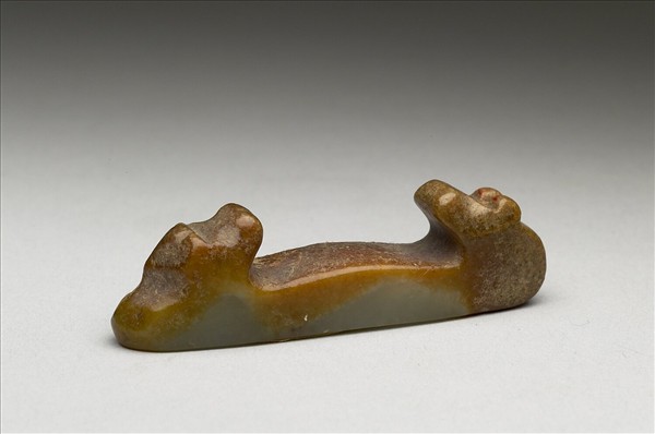 青玉,因沁染局部呈褐紅色,兩端高突,作為筆架,似為舊玉改作。