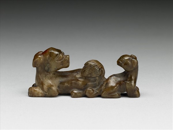 玉質因沁染而呈現今所見顏色。立雕子母雙犬,臥伏回首相望,狀極溫馨。