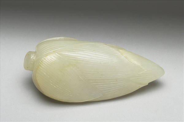 玉質,色白微有淺棕色絲紋,質地光潤。全器雕刻為一玉米,玉米皮層疊包覆,纖維紋理豐富,首端有蒂,上飾圈紋一圈。器上貼黃籤「毓七百四□」。本件個頭嬌小且無穿孔,應是擺飾把玩之用。
