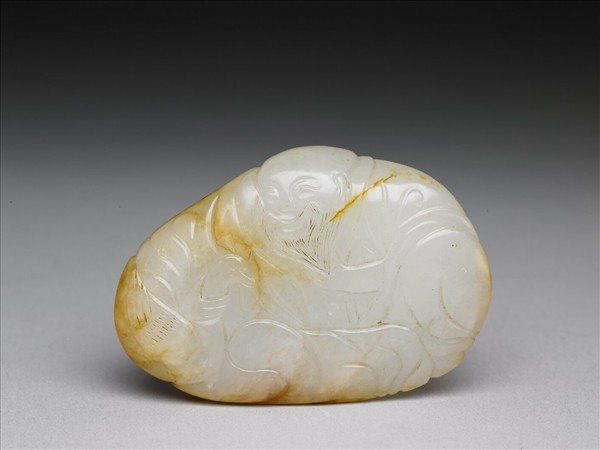 玉質,帶黃斑。狀如小卵石,器面琢一仙翁,左手拈髯,右手撫水禽。