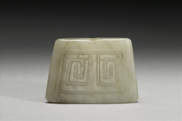 白玉,扁梯形,上下有通心穿,仿戰國晚期至漢代「劍珌」形制。器外壁陰線琢刻回紋為飾,陰線淺而寬,折角處或見琢痕稍收之狀,或為砣具製作的痕跡。