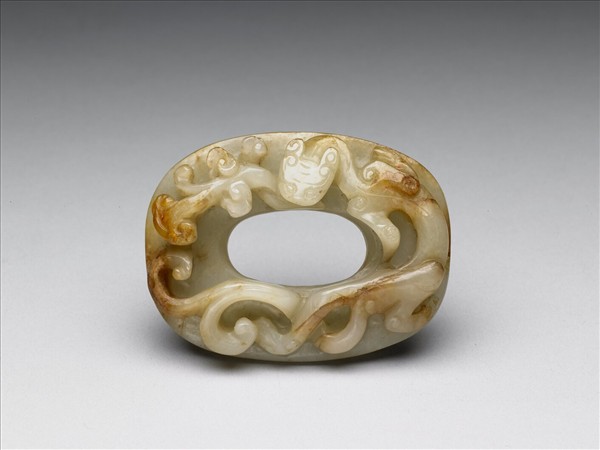 玉質,有黃斑。橢圓璧形,正面飾浮雕一螭銜靈芝,背面琢有凸棱。清代收儲於一雕漆花卉圓盒內。