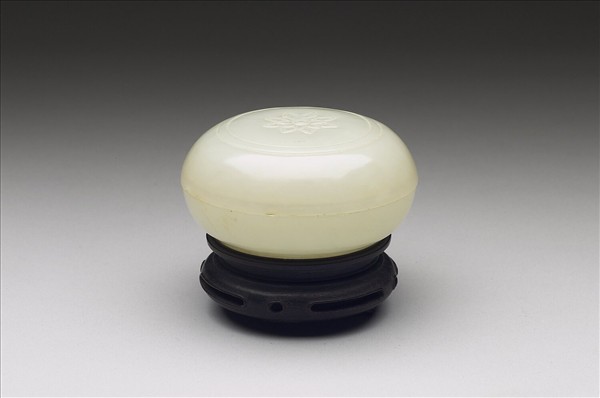 白玉。蓋與器略相等,弧形壁,有圈足。蓋上有平展八瓣花卉圖案浮雕。附木座。其蓋上有一角缺損。