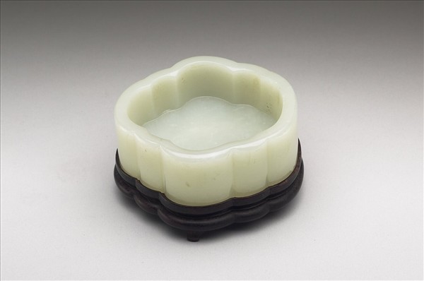 白玉,玉色泛青。全器作八瓣菱花形,每瓣大小不一。直壁、平底。壁略厚。附木座。