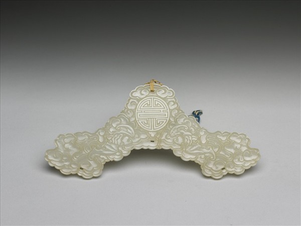 白玉,玉色白而潤澤。全器為磬形,為陳設玉飾之上玉。其上有穿四,一在頂部,其餘三穿分別在下緣,均穿有繩。兩面均浮雕卷雲、蝙蝠與團壽字。是大型垂飾的一部份。