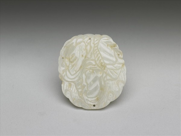 白玉,局部有赭黃斑。全器為橢圓形,其上有四穿,一在下緣,其餘三穿分別在上緣。佩兩面皆雕有山石流水,是大型垂飾的一部份。