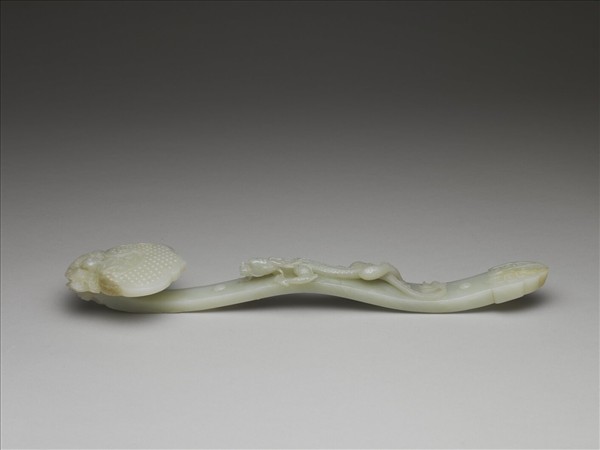 玉色透青。以「海龍朝珠」為如意紋飾題材,如意首作如意造型,並浮雕乳丁紋,頂部浮雕祥雲,中雕一火龍珠;柄中央弧凸處雕刻一半立體長龍,作戲珠狀;趾呈如意雲頭形,浮雕一對拐子龍,背面上端浮雕朵雲紋。