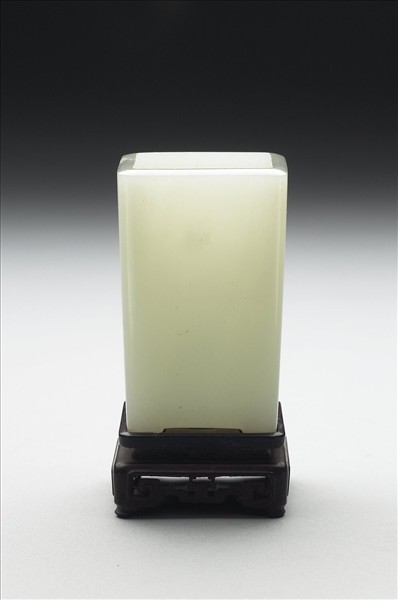 白玉,玉色泛青。全器為方筒形。直壁略斜、底作四小足。附木座,座上浮雕四瓣花及如意圖案。