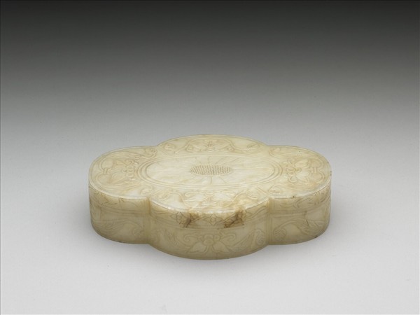 白玉,玉色泛黃,有赭斑。四瓣花海棠式盒,蓋與器身略相等。平蓋、直壁、平底。盒外陰刻平展花卉與卷草紋飾,應為仿自痕都斯坦玉器。
