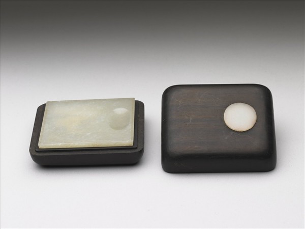 白玉,玉色微黃,有白綹。全器呈長方形,面有橢圓形墨池。附有嵌玉紫檀木盒。全器呈長方形,平頂蓋,蓋沿轉折處略圓。蓋與器略相等。蓋面一端嵌有圓形玉片。