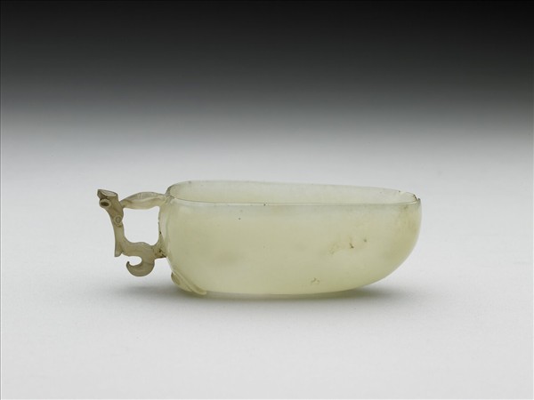 白玉,有灰斑。器形仿青銅匜。全器略呈橢圓,應為半桃形,以立雕桃枝作把手,一旁並飾有葉片。