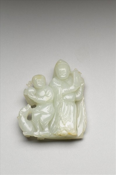 白玉,玉色泛青。全器略成扁形,雕作兩人物,身穿長袍老者與持桃童子,一旁有鹿趴伏於地。
