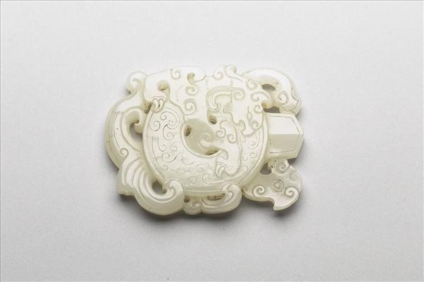 白玉,玉色白。全器略呈扁圓形,中央部份作「圭璧」之形,其上陰刻卷雲紋,前後各有一鳳紋盤繞。